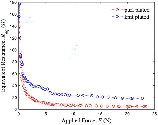 Resistance variations of the purl and knit plated sensors plotted as a function of applied force.