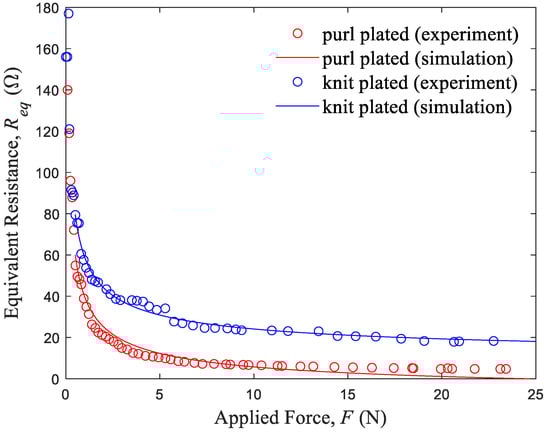 Simulated and experimental values of the plated sensors’ resistances plotted as a function of applied force.