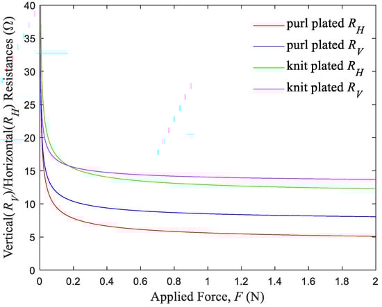 The relationship of the contact resistances (RCV, RCH) with the force applied to the fabric sensor and their relationships with RV and RH are crucial for simulating the equivalent resistance—the applied force curve. RCV, which is the contact resistance of vertically overlapped conductive yarns, is calculated using Holm theory [], by which it is inversely proportional to the square root of the contacting normal force (FN):