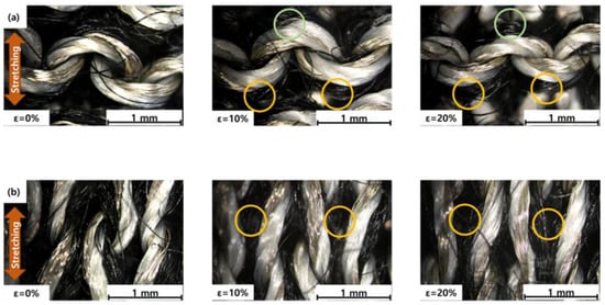 The behavior of non-conductive yarn in plated strain sensors was studied under varying loads using optical microscopy, with the results shown in Figure 7. Figure 7a demonstrates the purl plated sensor in both relaxed and elongated states. Key findings include the role played by non-conductive yarn among conductive yarns in determining the fabric’s mechanical properties. In a relaxed state, non-conductive yarns create noticeable separations and gaps in the fabric’s interlocked and jammed loops. Under a 10% strain, these yarns retract, thereby closing the gaps in a directional manner. Specifically, the non-conductive yarn located under a conductive needle loop rises, thus thickening the area above the conductive yarn (marked in green), while the yarn that is located under a conductive sinker loop descends (marked in yellow). This vertical movement is essential for enhancing contact between loops, as shown in the circled areas in Figure 7a. This pattern persists and becomes more pronounced at a 20% strain, indicating a consistent mechanical response.