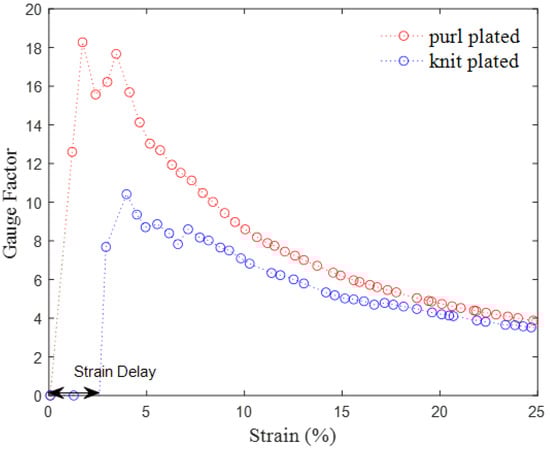 The variation in the gauge factor of the purl and knit plated sensors as a function of strain.