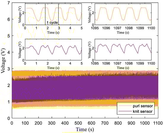 Figure 9 presents the output voltage variation over 1000 bending cycles for two different sensor structures. The insets show the strain–output voltage curves for four bending–recovery cycles at the initial and final stage of bending, thus highlighting the elapsed time–output voltage curves for single bending–recovery cycles of the purl plated fabric sensor and the knit plated fabric sensor. The insets also show the behaviors of one bending cycle of the sensors. During bending, the output voltage initially increases, after which it rapidly decreases as the fabric extends further. At maximum fabric elongation, the voltage drops to its lowest point. During recovery, as the fabric relaxes, the voltage first increases and then decreases []. This variance in the output voltage at different stages of bending and recovery is attributed to the strain delay in the fabric, thus reflecting the hysteresis of the devices.