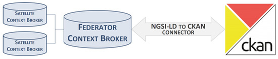 This section presents the proposed solution to address the problem stated in the article: the interworking between the NGSI-LD and the Open Data worlds. Figure 1 shows the baseline scenario including the two key components from each of the two worlds that the implemented connector has to make to interwork. The NGSI-LD world is presented on the left side through a set of CBs in a federation setup, whereas the Open Data world is depicted on the right side via a CKAN instance. The solution proposed takes place between these two components, along with some other processes needed in order to automate the whole pipeline. These additional modules will be further detailed below.