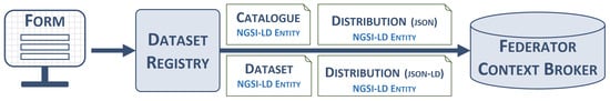 The next component involved in the architecture is the Dataset Registry module, whose source code is available in [26]. This module generates the NGSI-LD entities and injects them into the FCB, which is the last element depicted in the initial stage architecture. More precisely, the Dataset Registry module is responsible for performing the transformation between the output of the form (plain text or JSON, depending on the design) and the defined NGSI-LD entities. Such transformation exploits the principles of linked data provided by the NGSI-LD standard, building relationships between the different entities to generate the tree structure inherent in DCAT-AP. Once these entities are generated, in this case four of them (Catalogue, Dataset, Distribution with JSON format and Distribution with JSON-LD format), the component injects them into the FCB, making them available from the platform’s single access and ready for the next step in the chain.