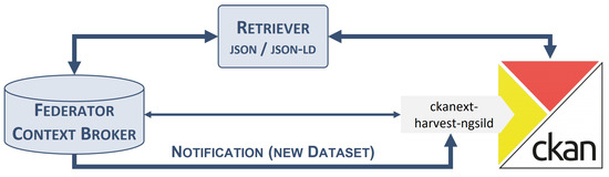 Focusing on the CKAN submodule, it has been already mentioned in Section 2 that CKAN allows the development of extensions, so that its functionality and features can be extended for the convenience of the user [27]. Taking this into account, this extension submodule called ckanext-harvest-ngsild has been developed (source code available at [28]), and is responsible for harvesting the description entities (Catalogue, Dataset and Distribution) stored in the FCB and injecting them into the deployed CKAN instance.