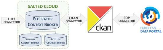Figure 5 illustrates the final architecture of the use case, incorporating the connectors described so far. The key components are the federated architecture of CBs, which exposes the data enriched within the DET deployed in SALTED (and hosted in the SALTED Cloud) through its NGSI-LD API; the SALTED CKAN-based Open Data portal, which describes the datasets available; and finally the EDP with the SALTED data catalogue.