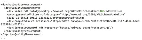 Quality metrics for a dataset that has undergone the complete workflow are provided in [43] and illustrated in Figure 7. In [43] it can be seen that the dataset (Parking:ParkingSpot in particular) scores highly in all metrics except ByteSize, since it was not possible to determine the total size of the dataset due to a design constraint that defined the datasets as real-time values. According to the EDP documentation [37], 405 points is the maximum that can be achieved. In this particular case, in the absence of the points related to the ByteSize property, a total of 400 points is obtained, as can be seen in Figure 7. This file extract is sourced from the Data Quality Vocabulary (DQV) file [44], encompassing values for each metric and the overall points computation.