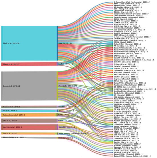 To address issues of insufficient labels and high annotation costs in road extraction tasks https://www.isprs.org/education/benchmarks/UrbanSemLab/ (accessed on 2 March 2024), this paper classifies network models based on the use of pixel-level labels, including fully supervised learning, semi-supervised learning, and weakly supervised learning. In this paper, “road extraction”, “deep learning”, and “remote sensing” were chosen as searching keywords. The Web of Science (WOS) and Google Scholar databases were used as literature search tools to primarily retrieve relevant literature from 2020 to 2023. We organized the publicly available datasets mentioned in the retrieved literature over 40 datasets (2013–2023). This compilation includes 22 publicly accessible road datasets, with images primarily sourced from Google Earth, OpenStreetMap (OSM), open APIs, drone imagery, and satellite imagery, covering urban, suburban, rural, and forested areas. Furthermore, we observed that multiple publicly available road datasets such as Massachusetts [], ISPRS1, CasNet [], DeepGlobe [], SpaceNet [], Roadtracer [], Ottawa [], and CHN6-CUG [] were utilized two or more times between 2020 and 2023, as depicted in Figure 1. In Figure 1, the leftmost column represents the number of times datasets were used during these four years, while the rightmost column indicates the number of times corresponding network models utilized the datasets. Additionally, we conducted research on pre-processing and post-processing work related to remote sensing images in the relevant literature. For instance, a real-time multi-temporal color data enhancement technique was introduced for improving Sentinel-1 multi-polarization and Sentinel-2 multi-spectral imagery datasets []. Image quality was enhanced through the application of the contrast-limited adaptive histogram equalization (CLAHE) algorithm to mitigate mountain shadow issues []. Post-processing tasks included road vectorization [], road information, and label reconstruction [], among others. Due to space constraints, this paper primarily focuses on the analysis and discussion of road feature extraction research based on fully supervised deep learning network models. The structure of this paper is as follows: Section 1 introduces and briefly elucidates the challenges and methods in the field of road extraction from remote sensing images. Section 2 delves into road feature extraction using fully supervised deep learning network models while studying the strengths and limitations of these network models. Section 3 explores road feature extraction through semi-supervised (weak) deep learning. Section 4 presents a comprehensive review of road extraction methodologies, conducting a comparative analysis of diverse models in terms of their performance. Ultimately, we objectively discuss the limitations inherent in current supervised learning models. Section 5 put forwards future prospects of road extraction and challenges.