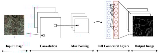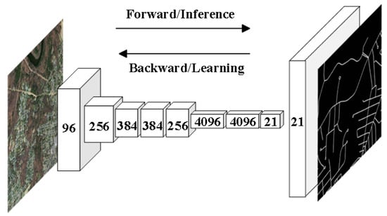 Mnih [] first introduced convolutional neural networks (CNNs) into road extraction tasks. Initially, in the field of deep learning for road extraction, many researchers used block-based CNN models to process roads within images. For example, finite state machine (FSM) and patch-based CNN (as shown in Figure 2) methods were employed [] to track and extract roads separately. These patch-based CNN models performed excellently in aerial images with a spatial resolution of 1.2 m but struggled to achieve satisfactory results in higher-resolution (0.15 m) image extraction. To address this issue, Rezaee and Zhang [] improved traditional patch-based CNN methods, enabling them to outperform support vector machine (SVM) methods in road extraction from high-resolution image datasets (0.15 m spatial resolution). However, patch-based CNN methods overly relied on the sliding window approach, which involved feature extraction through convolutional and pooling layers, followed by backpropagation to fine-tune the final parameters. This resulted in relatively low extraction efficiency, which was insufficient for meeting the requirements of practical applications. Additionally, choosing an appropriate sliding window size was a challenging task. It was not until the emergence of fully convolutional neural networks (FCNs), that this problem was effectively solved. The FCN model was first introduced into the field of image segmentation [], as shown in Figure 3, and it significantly improved segmentation efficiency. In contrast to traditional patch-based CNN models, an FCN is capable of pixel-level image classification, meaning it classifies each pixel into a category, with the output providing the category for each pixel. The FCN replaces fully connected layers with convolutional layers, achieving end-to-end semantic segmentation. This overcomes the inefficiency issue of patch-based CNN methods and allows for the extraction of target semantic information while preserving spatial information []. While the FCN enhanced the CNN by enabling pixel-to-pixel classification, it disregarded the relationships between pixels. Therefore, subsequent models introduced various attention mechanism modules to strengthen the relationships between pixels. Furthermore, the FCN’s structure has offered novel insights into encoder–decoder network architectures.