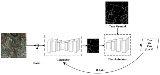 In 2017, the Pix2pix [] model was introduced, which is based on the structure of conditional generative adversarial networks (CGAN) for image-to-image transformations, also referred to as domain adaptation. In this approach, the generator of the model utilizes a U-Net network, while the discriminator is designed using the PatchGAN architecture. Many researchers continue to reference this model in current road extraction tasks. For instance, Yang and Wang [] followed the structure of Pix2pix and introduced the WGAN-GP network for rural road extraction. They used both U-Net and BiSeNet as generators, employing an ensemble strategy to combine their inference outputs for better road vector generation. The discriminator in their model used PatchGAN. Cira et al. [,] applied the Pix2pix model to post-process road extraction. They improved the integrity of road surface area extraction by contaminating labels and reconstructing them. In addition, Abdollahi et al. [] proposed a deep learning approach using conditional generative adversarial networks (CGANs) for road segmentation in high-resolution aerial imagery. They utilized an enhanced U-Net model (MUNet) as a generator to segment images and obtain high-resolution segmented maps of road networks. NIGAN [], comprising two CGAN networks, was used for scene selection in mountainous road scenarios. This was caried out to pre-select areas that contain mountainous road scenes, thereby reducing the workload in subsequent segmentation and road extraction tasks. The generator in their model is based on an encoder–decoder structure, utilizing ResNet-34 as the backbone. Middle layers incorporate dilated convolutions, which are helpful for extracting small objects like roads and expanding the receptive field while enhancing global information.
