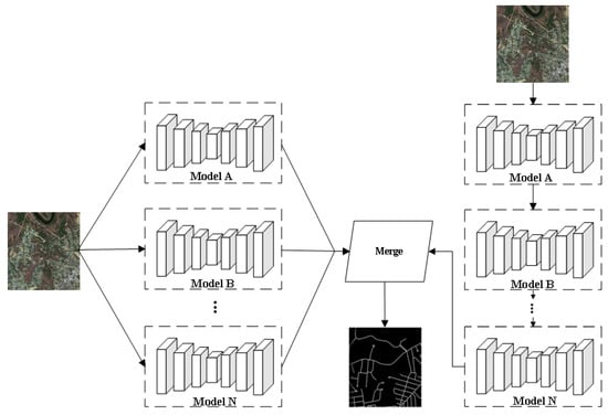 In road extraction tasks, ensemble strategies have been increasingly adopted by researchers to combine multiple models serially or in parallel. Integrated models with strong generalization capabilities, high robustness, and exceptional segmentation performance have been highly sought after in research endeavors. Parallel strategies (Figure 6) are most commonly used. For example, Senthilnath et al. [] employed three relatively mature network models, FCN-32, Pix2Pix, and CycleGAN [], for transfer learning. Both Pix2Pix and CycleGAN are commonly used in domain transfer tasks. The key difference is that Pix2Pix requires training data to be in pairs, which is challenging to find in the natural world. The emergence of CycleGAN effectively solves this problem. They proposed the Deep TEC integrated classifier, which utilizes a parallel strategy to integrate the results of road segmentation from three models. This approach achieved outstanding integration performance in extracting urban road networks from drones. Cira et al. [] combined improved CNN, VGG, ResNet-50, and Inception-ResNet [] models in parallel and fused extraction results using an averaging structure. This strategy aims to leverage the strengths of each model while minimizing their weaknesses, ultimately resulting in a classifier with reduced classification error. Chen et al. [] employed ResNet-50 models with three distinct convolution kernel sizes for road extraction, integrating the results to form a ResNet-50 training block enriched with high-level information. Li et al. [] reorganized the layers of U-Net and duplicated a single submodel N times, creating an ensemble model E consisting of N parallel submodels. Following optimization and prediction, they ultimately established an E-UNet model with 14 layers. Abdollahi et al. [] adopted a parallel approach by linking two improved U-Net models, BCL-UNet (ConvLSTM [] + U-Net) and MCG-UNet (BConvLSTM + SE + dense convolutions []). They introduced dense convolutions and compression activation modules in the upsampling layers of the standard U-Net. They employed bidirectional convolutional long short-term memory (BConvLSTM) for skip connections, enabling the generation of high-resolution segmentation maps even in challenging backgrounds while preserving edge information. The graph-based dual convolutional network (GDCNet) [] integrates graph convolutional networks (GCNs) and CNNs. Employing a ResNet-50 backbone that included encoder and decoder convolutional neural networks, researchers applied a parallel approach for road extraction, effectively addressing concerns associated with poor connectivity and discontinuities. This was achieved by generating complementary spatial–spectral features at both superpixel and pixel levels and efficiently propagating these features between graph nodes and image pixels using a graph decoder. Sun et al. [] employed a parallel network model consisting of dual branches for road and building extraction. One branch is the multi-resolution semantic extraction branch, composed of three parallel ResNet networks, used to extract semantic features of roads and buildings at different resolutions. The other branch is the Transformer semantic extraction branch, which utilizes a ResNet-18 backbone and features a Transformer-based encoder–decoder. This parallel strategy successfully addresses the current limitation of semantic segmentation networks in terms of receptive field by fusing the output results of the two branches.