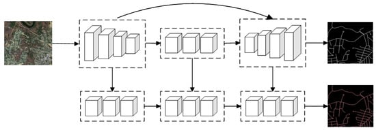 Certainly, a serial strategy employing multiple models for road extraction is also utilized by some researchers. For instance, a direction-aware residual network, DiResNet []. DiResNet comprises a ResNet segmentation network (DiResSeg) based on the decoding layers with structural supervision and a refinement network (DiResRef) based on U-Net. The former is dedicated to enhancing the learning of road topology, while the latter further refines the road segmentation results. Z. Chen et al. [] drew inspiration from the AdaBoost classification algorithm and combined multiple lightweight U-Net models by connecting them in a serial manner, forming AdaBoost-like end-to-end multiple lightweight U-Nets (AEML U-Nets). Under this serial strategy, the output of the previous network serves as the input for the next one. To ensure the training quality of each U-Net, the researchers designed a multi-objective optimization strategy for joint training of all U-Nets. Finally, the output results of each U-Net are fused to obtain the ultimate road extraction result.