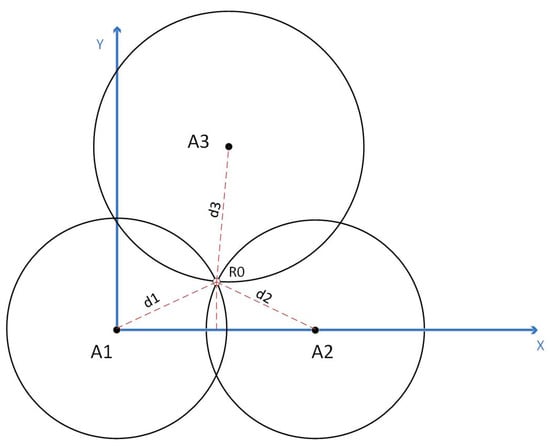 In our experiments, TOA positioning was selected. Unlike other positioning methods, TOA does not require advanced hardware or complex signal processing algorithms, and it is relatively easy to implement. It has high accuracy and a relatively simple implementation method. Moreover, TOA positioning is based on time measurements, and its measurement accuracy can reach the sub-nanosecond level or better. Therefore, it has high positioning accuracy and a good ability to suppress multipath effects. The schematic diagram is as follows: