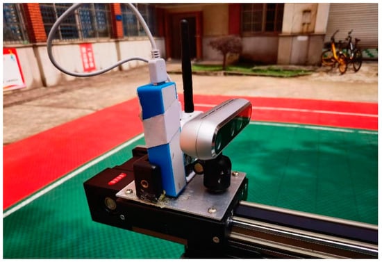 The camera used on the mobile positioning platform is Intel’s Realsense-D455 model camera (Intel, Santa Clara, CA, USA), with a resolution of 1280 pixels by 720 pixels. The sampling frequency was set to 10 Hz. The UWB used was the Decawave’s DW1000 communication and ranging module (DecaWave, Dublin, Ireland), with a bandwidth of 3.5–6.5 GHz and a data sampling frequency of 10 Hz. In order to accurately obtain the system error of each anchor point of the UWB, a mobile calibration platform was constructed in this experiment, as shown in Figure 4. The platform consists of three main parts: aluminum profile chassis, a control box, and a synchronous belt. Both the UWB and the camera are fixed on the moving slider of the synchronous belt of the mobile calibration platform. By controlling the synchronous belt via the control box, the speed, acceleration, and spatial coordinate values of the two sensors can be accurately obtained. Time tags are added to the data collected via UWB positioning and the camera, ensuring that these time tags are consistent with the system time of the computer. Data are collected from both sensors on the laptop at the same time.
