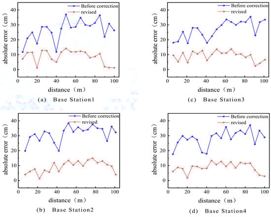 Figure 6 shows the relationship between the absolute error and distance of each anchor point, both before and after correction. As shown in Figure 6, there is a difference in the absolute error between the measured values of each anchor point at the same true distance and the environment, which is caused by hardware factors. Moreover, the measurement error of each anchor point fluctuates between 0.010 and 0.040 m at different distances. This indicates that there are certain systematic and random errors in UWB distance measurement.