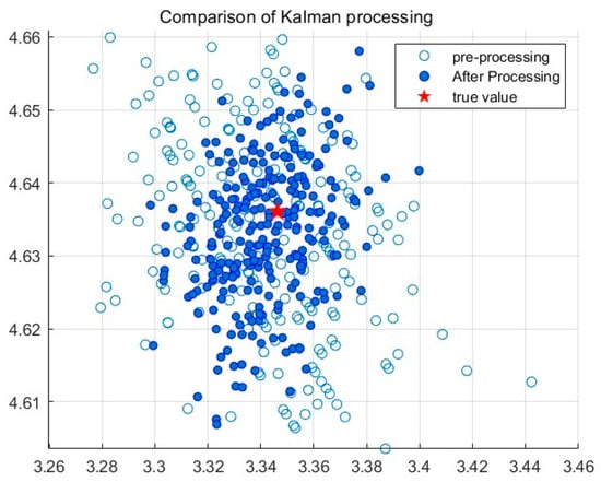 The system error remains relatively stable throughout the entire measurement system process. In order to eliminate the impact of the system error on the positioning results, the system is calibrated by collecting reference point data at a known distance, establishing a system error compensation model, and applying it to distance measurement. The corrected absolute error is shown with the blue line in Figure 6. A comparison of measurement error data before and after correction is shown in Table 1. The random error is processed using a Kalman filter, and the results before and after processing are shown in Figure 7.