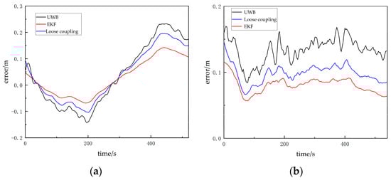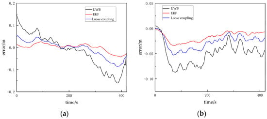 It can be observed that, compared to the loosely coupled mode, the visual/UWB-EKF fusion system reduces the root mean square error in the x direction from 0.106 m to 0.076 m, and, in the y direction, it reduces it from 0.086 m to 0.082 m. The maximum positioning error in the x direction decreases from 0.195 m to 0.146 m, and, in the y direction, it decreases from 0.148 m to 0.122 m. The experimental results demonstrate that the visual/UWB-EKF fusion model effectively addresses the issue of large trajectory errors in UWB positioning and suppresses the impact of UWB NLOS errors on the fusion system’s positioning accuracy. See Table 3 and Figure 12.