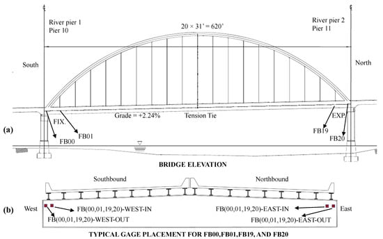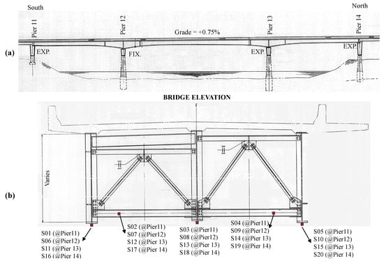 Instrumentation plan of the Birmingham Bridge. (a) Elevation view from East. (b) Cross-section view from south side. The figures were adapted from instrumentation plans provided to the authors by the project sponsor.