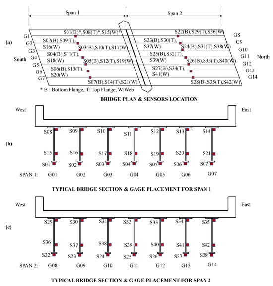 Instrumentation plan of the Chester Bridge according to the information provided by the project sponsor. (a) Bridge plan and location of the sensors at both spans of the bridge. (b) Bridge section of span 1 and placement of the wireless strain gages. (c) Bridge section of span 2 and placement of the wireless strain gages.