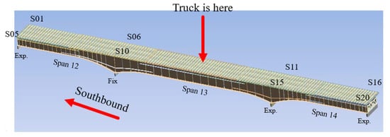 Clairton Bridge analysis. Schematics of Load Case 2: the load of a truck in the southbound direction is applied to the middle of Span 13.