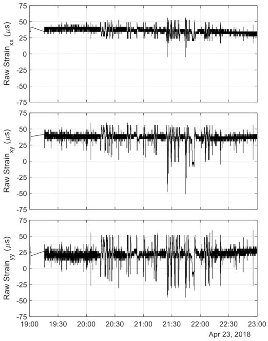 For illustrative purposes, Figure 7 shows the raw strains recorded by the rosette FB01-West-IN. The label indicates that the sensor was on the west side of floor beam 1, farther from the tension tie. The number of twin-spikes between the hours 20:00 and 22:15 is consistent with the 18 truck crossings. The baseline strain, i.e., the measurement without the truck, remained nearly constant, as the temperature of the steel did not change much during the experiment.