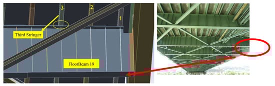 Table 3a lists the maximum vertical (XX) and horizontal (YY) strains recorded by the four rosettes located on the east side of the bridge while the truck crossed the northbound bike lane (twice). Note that if E = 29,000 ksi, the value of 100 με corresponds to 2.9 ksi of stress. The sensors did not peak simultaneously. For example, the maximum YY strain at FB19-EAST-IN (equal to −79.4 με) did not occur when sensor FB19-EAST-OUT experienced its maximum value of −12.7 με. When this was the case, an asterisk on Table 3 indicates the strains recorded at the same instant. This choice enables the comparison of the numerical calculations computed with a truck at a specific bridge location and the consequent deformation across the neighboring sensors. Table 3b lists the results associated with the rosettes located on the west side of the bridge when the truck crossed the southbound right lane (twice). The experimental values listed in the table were extracted from the tables reported by the company responsible for the truck test and made available to the authors of this article by the project sponsor. The asterisks label those values extrapolated from the strain waveforms presented in the mentioned report. Table 3 shows that the experimental strains recorded by the sensors that are equidistant from the centerline of the bridge did not deform evenly. For example, the FB01-East-IN rosette responded differently during two identical crossings (−73.40 με vs. −57.5 με). Similar considerations can be made for FB19-West-Out along the YY direction (22.00 με vs. 28.00 με). This mismatch may be attributed to experimental uncertainties, including the fact that the sensors are bonded to areas of stress concentration. Despite the complexity of the structure, the numerical results under pristine conditions overall agreed well with the experimental values. The rightmost column of each graph quantifies the percentage difference between the original design and the numerical damaged scenario. For the inner gages, the variation in the predicted strains may be significant. The origin of such variation is illustrated in Figure 9, which explains the difference between the load transferring from the stingers to the floor beams under pristine conditions and under Damage Scenario 3. The third stringer contributed to the load transfer to the floor beams; therefore, some of the truck load was shifted toward the tie girder. Thus, the damage caused more compression at the locations of inner sensors. Similarly, according to the FE model’s results presented in Table 3, the inner sensors in YY direction showed more compression.