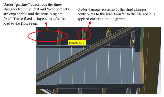 Birmingham Bridge. Load transfer mechanism between stringer 3 and FB19 under pristine conditions and Damage Scenario 3. Note that the numbers on the figure label the stringer number.