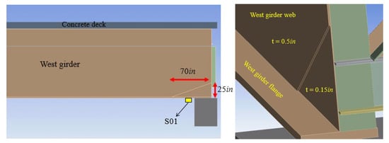 The analyses associated with the other damages showed the following. The reduction of the modulus of elasticity of the steel (case scenario 1) increased the overall strains by about 5%, consistent with the linearity of the model and the fact that most members of the bridge are made of steel. When the modulus of the concrete deck was reduced by 15% (case scenario 2), the strains were 1.5% higher than the original design. This modest increase was driven by the dominance of the steel elements. The removal of the diaphragms and diagonal bracings from the middle of Span 12 (west side) and Span 13 (east side) did not affect the overall strains at the sensors’ locations. This is compatible with the fact that the simulated damage was too far away from the sensors. This was proven by evaluating the strains at the middle of Span 13. Under Load Case 2, strain difference is in the order of 4–6%, proving that sensors’ locations are a key factor in the success of any health monitoring program. When the modulus of elasticity of the middle girder was reduced by 10% (Damage 4), the girders experienced about 2–3% higher strain. Because the damage changed the stiffness of the middle girder, load distribution between the girder changed. The last simulation on the Clairton Bridge consisted of adding a 0.5-inch rectangular plate to the location of the previous damage scenario in order to mimic a repair (Figure 11). The subsequent analysis demonstrated that the repair reinstated the pristine condition of the girder.