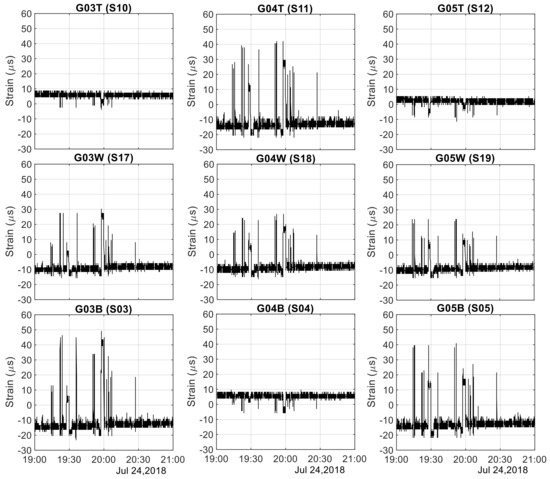 Chester Bridge truck testing. Raw strains recorded by the sensors bonded to Girder 3 (left column), Girder 4 (middle column), and Girder 5 (right column). From top to bottom, the sensors were those bonded to the top flange, the web, and the bottom flange. The horizontal axis represents the date and the hours during which the test was performed.