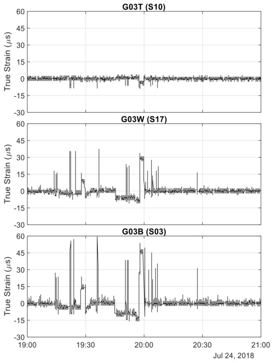 The graphs of the true strains (Figure 13) prove that the thermal-related bias is removed while keeping the information relative to the strain increase caused by the truck. As a matter of fact, the values of the peaks are not uniform, consistent with the fact that the truck crossed the bridge at different lateral distances, i.e., above different girders.