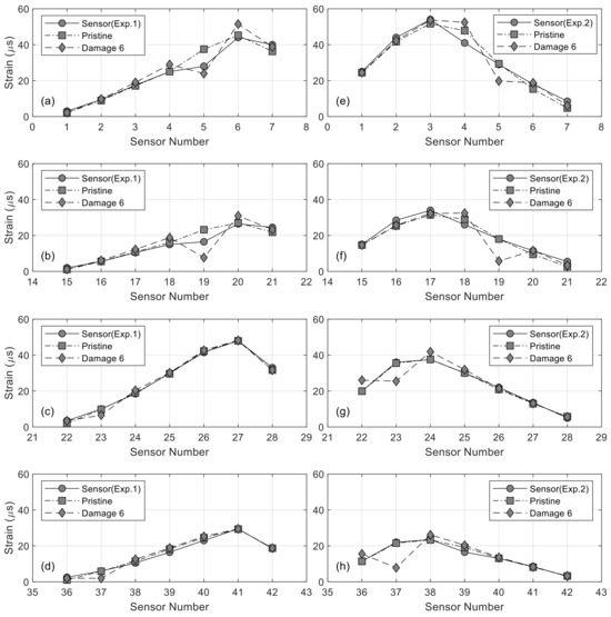 Chester Bridge. The predicted strains at certain locations of the bridge for the sixth damage scenario. (a–d) Refer to Experiment 1, and (e–h) refer to Experiment 2. In Exp. 1 and 2, the truck travelled over the bridge northbound and southbound, respectively. For (a,b,e,f), the truck is at the middle of the first span, and for (c,d,g,h), it is at the middle of the second span. The field data were extracted from the graphs published by the company executing the test in the report provided to the authors by the project sponsor.