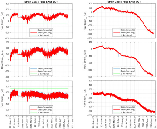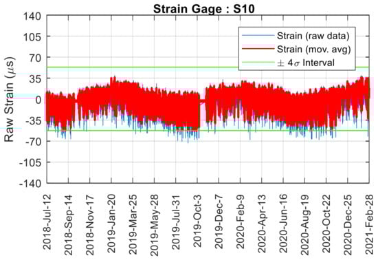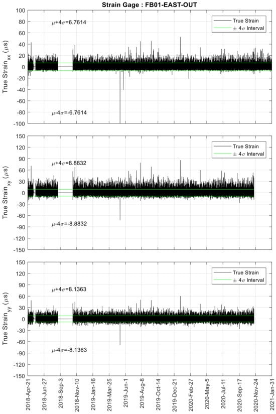 A representation of the true strain computed from FB01 of the Birmingham Bridge is provided in Figure 21. Each time-series was completed with the superposition of two horizontal lines that represent the strain range ±4σ. A few abnormal peaks were seen in spring 2019, and their origin could not be determined, although it may be the effect of the simultaneous crossing of heavy trucks. Besides the identification of spikes attributable to transient events, graphs like those shown in Figure 22 can be used to ascertain the responsiveness of the bridge to traffic loadings. A quantitative measure could be the estimation of the ±4σ interval. This analysis is presented in Figure 22. When comparing the graphs from the other strain gage, the north side of the bridge seems to experience more traffic load than the south side. Overall, the rosettes bonded on the outer side of the cope were less subjected to the effect of traffic. Interestingly, the sensing system on the south side of the bridge reported intervals that were 10–20% higher than the south side. One possible reason is related to the road network. There are two ramps close to the north side (Pier 11) whereas vehicles travel at full speed when close to the south pier (Pier 10).