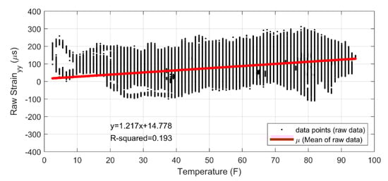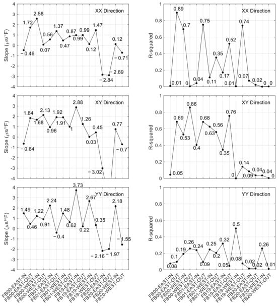 The deformation of the structures caused by the ambient temperatures was investigated as a possible marker for structural anomalies. To describe the procedure, Figure 17 presents the raw strains and the associated temperature from the Birmingham Bridge. The equation of the linear regression and the corresponding R2 values are overlapped. The strain gradient, namely the slope of the regression, and the R2 from all of the rosettes bonded to the Birmingham Bridge are displayed in Figure 18. Most of the gradients are positive, which means that the structural member expanded with the increase in the temperature. The two evident exceptions were the two rosettes bonded on the east side of FB20. As those sensors drifted, their reliability is questionable. Looking at the residuals, those associated with the direction perpendicular to traffic (YY) were lower than the vertical and diagonal directions. Most of the gages with the lowest R2 (<0.1) also exhibited the slope closest to zero, which implies that the corresponding structural member was not prone to significant thermal effects. The behavior of the gages bonded to symmetric members was not necessarily similar. For example, the slopes associated with FB00-EAST-IN and FB00-WEST-IN were equal to −0.46 με/°F and 2.58 με/°F (along XX), respectively, and −0.64 με/°F and 1.68 με/°F (along XY), respectively.
