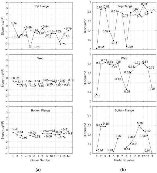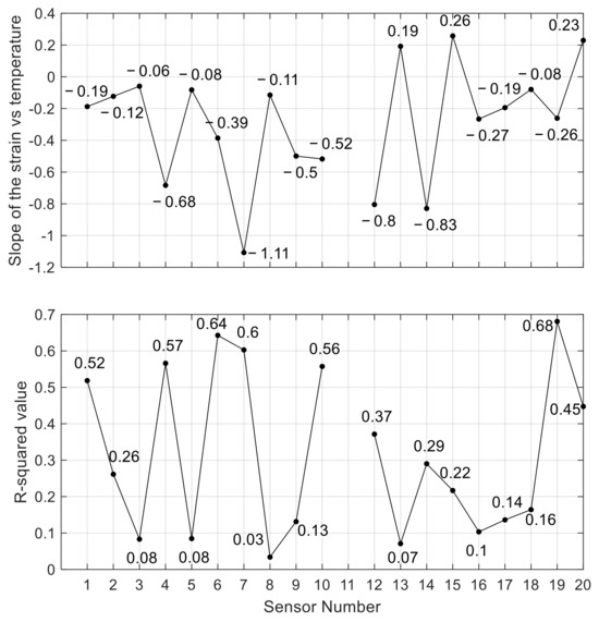 (a) Slope of linear interpolation of the strain vs. temperature graphs. The values are expressed in με/°F. (b) Residual R2 of the linear interpolation strain vs. temperature.