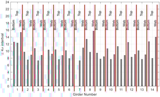 The same analysis was carried out for the other two structures. For the Clairton Bridge, the analysis did not reveal anything significant. The ±4σ interval for most gages was below 10 με, i.e., within the resolution of the sensors. The results relative to the Chester Bridge (Figure 23) show that the largest ±4σ intervals are associated with the sensors bonded to the web of Girders 1, 8, and 14, which are located on the outer side of the bridge (east side or west side). Figure 23 also shows that most of the sensors bonded to the top flange had values below 8 με. None of the forty values reported stood out from the others, suggesting that all of the elements being monitored responded normally.