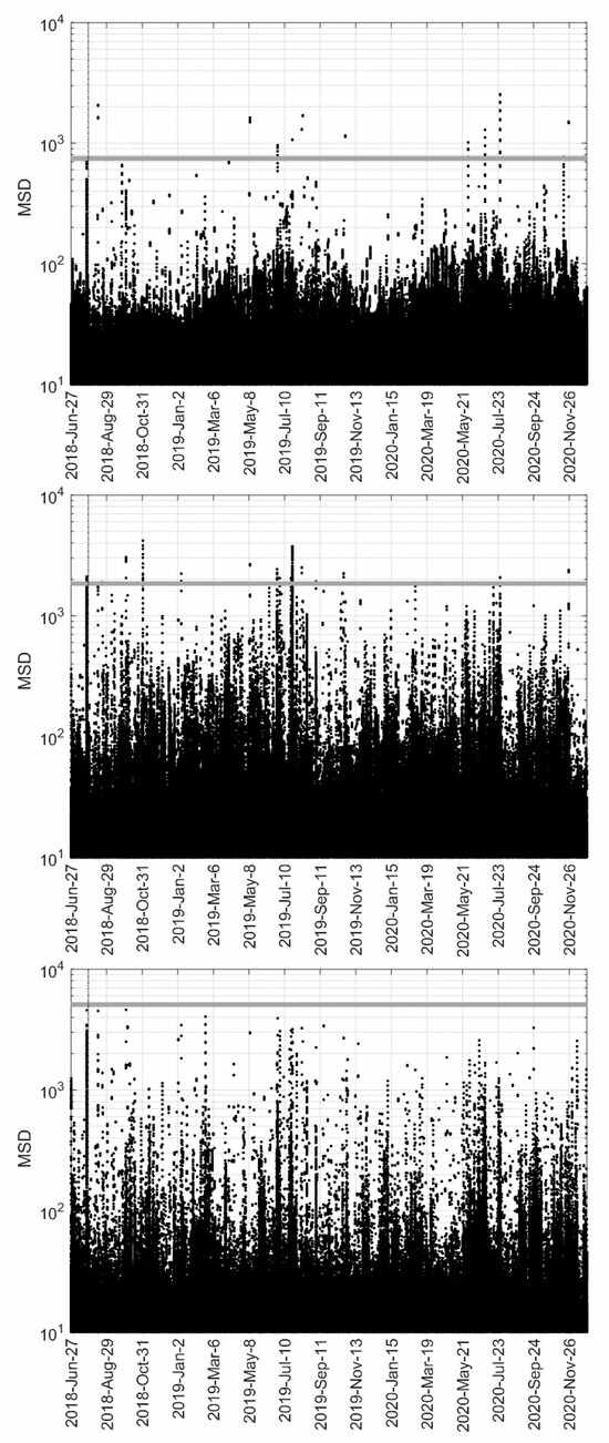 Mahalanobis squared distance applied to the whole monitoring period of the Chester Bridge. (Top row): top flange. (Middle row): web. (Bottom row): bottom flange. The threshold was computed by considering the data from the first month of operation without the truck test. The horizontal axis of the left plot represents the monitoring timeframe considered in the graph.