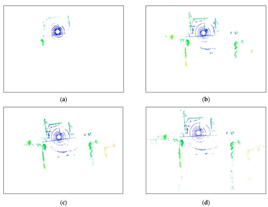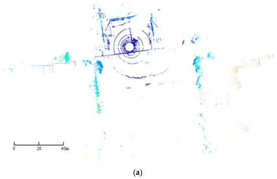 In the experiment, the LiDAR was used to collect a total of 303,965 data points in an outdoor real environment. The obtained point cloud not only includes the three-dimensional spatial coordinates of a large number of data points but also the reflectivity of the targets. The scanned objects primarily included buildings, trees, the ground, vehicles, and pedestrians. The collected dataset was stored in the CSV format. To ensure data consistency and usability, the raw point cloud underwent preprocessing, including the removal of header rows and data type conversion. The raw point cloud is shown in Figure 2.