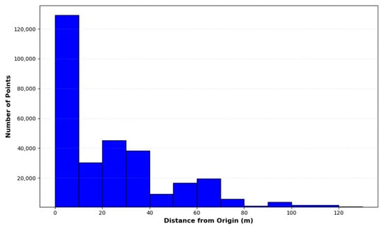To understand the spatial distribution characteristics of the raw point cloud, this experiment plotted a histogram showing the distribution of points relative to the center of the LiDAR, as depicted in Figure 3. In this histogram, the horizontal axis represents the distance of data points in the point cloud from the center of the LiDAR, divided into intervals of 10 m; the vertical axis indicates the number of points within each interval.
