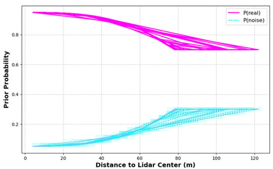 In the graphical representation, the pink line indicates the prior probability of real points, and the light turquoise line represents the prior probability of noise points, with the distance measured relative to the center of the LiDAR. As observed in Figure 4, the prior probability of real points gradually decreases with increasing distance, while the prior probability of noise points correspondingly rises. This probability distribution reflects that in ranges farther from the LiDAR center, the likelihood of data points being noise points increases, and the likelihood of them being real points decreases.