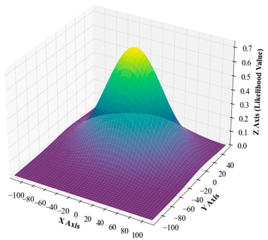 To validate the assumption that the PDF of real points in outdoor scenes conforms to a multivariate Gaussian distribution, this study first applied traditional denoising techniques to the collected raw point cloud. Subsequently, the likelihood values for each point in the denoised point cloud were calculated using Equation (6). Finally, a multivariate Gaussian distribution surface fitting was performed on the calculated likelihood values for each point, with the results shown in Figure 5.