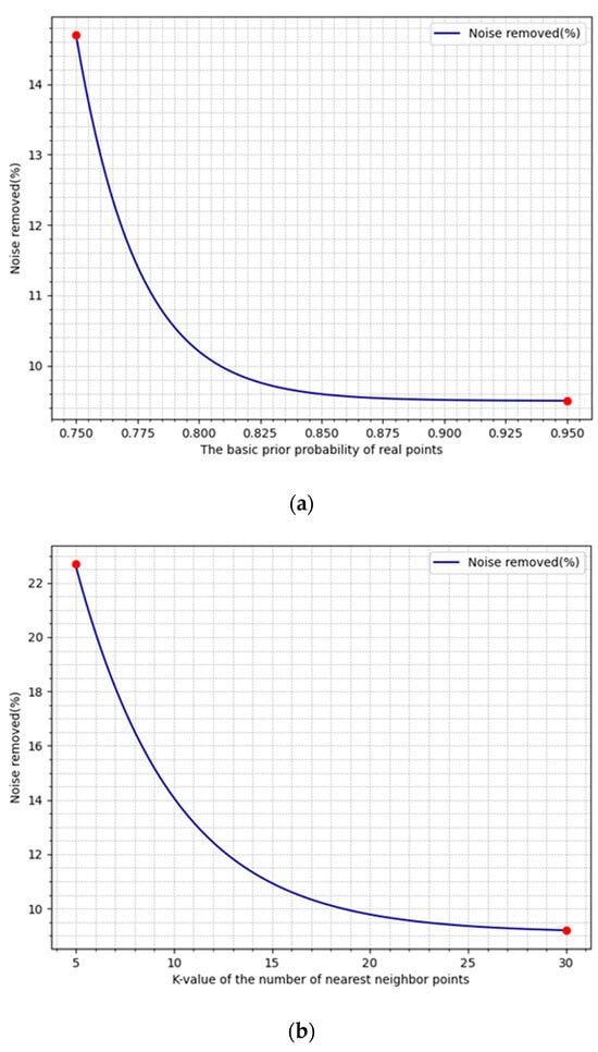 The impact of prior probability and the number of neighboring points (K) on noise removal. (a) The impact of prior probability changes on noise removal. (b) The impact of variations in the number of neighboring points (K) on noise removal.