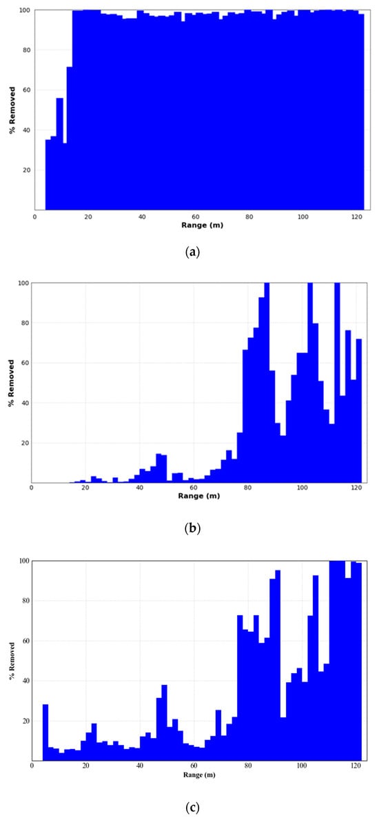 To quantify the quality of environmental feature preservation by the four filters, a plot was created showing the percentage of noise removed relative to the range, with the results shown in Figure 11.