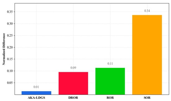 Figure 12 provides a quantitative comparison of the performance of the four denoising filters, assessed through the difference in normalized median variance. A smaller normalized value indicates that the denoised point cloud retains a higher similarity in local spatial consistency with the raw point cloud. As shown in Figure 12, the AKA-LDGS filter exhibits the smallest normalized difference, indicating its most significant denoising effect in real-world outdoor scenes. In comparison, the DROR filter performs second best, the ROR filter ranks medium, while the SOR filter exhibits the greatest normalized difference. Combined with the visual assessment in Figure 8d, it can be further confirmed that the AKA-LDGS filter demonstrates better denoising performance while preserving the environmental features of outdoor real-world scene point clouds.