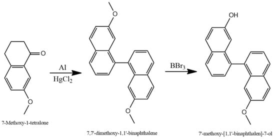 The resulting compound was demethylated by dissolving 4 g of it in 15 mL of dichloromethane to produce 7′-Methoxy-[1,1′-binaphthalen]-7-ol. At −78 °C, 2 mL of BBr3 were added drop by drop, and the mixture was stirred for 3 h. Subsequently, 2 g of ice were introduced, leading to the conversion of one of the methoxy groups of the molecule into an alcohol group (Figure 1). After an additional hour, the organic phase was carefully separated, washed with water, and dried under a fume hood.