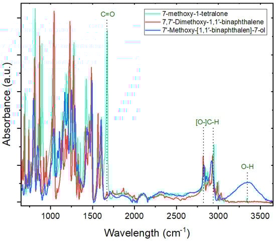 Comparison between the FTIR spectra of 7-methoxy-1-tetralone, 7,7′-Dimethoxy-1,1′-binaphthalene, and 7′-Methoxy-[1,1′-binaphthalen]-7-ol.