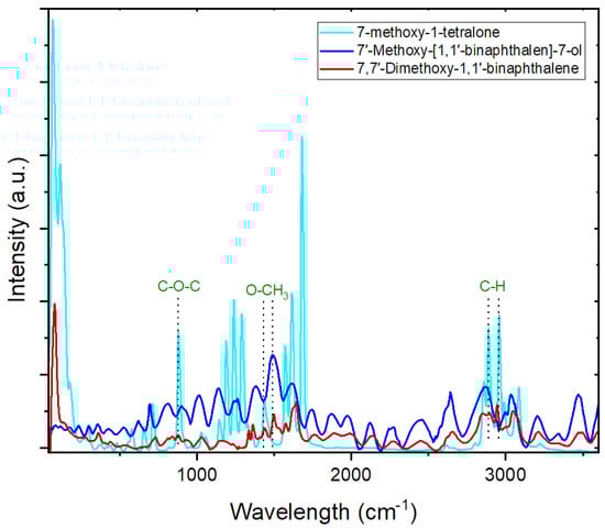 Comparison between the Raman spectra of 7-methoxy-1-tetralone, 7,7′-Dimethoxy-1,1′-binaphthalene, and 7′-Methoxy-[1,1′-binaphthalen]-7-ol.