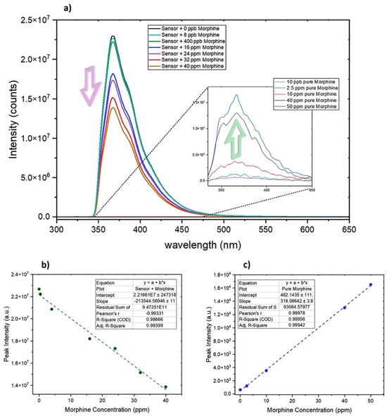 As seen in Figure 6a, pure-morphine standard solutions (in methanol) produced an emission peak of 366 nm (λex = 325 nm), which closely matches the fluorescence peak wavelength of 7′-Methoxy-[1,1′-binaphthalen]-7-ol at 369 nm. However, the intensity of the fluorescence emission of the sensor is significantly higher than that of pure morphine. As expected, with an increase in the concentration of morphine in the solution, the intensity of its emission peak shows a linear increase (R2 = 0.999; Figure 6c). However, for concentrations lower than 2.5 ppm of the morphine solution (in the absence of sensor), the emission-peak intensity is found to be very low, nearly indistinguishable from noise and the background spectra of pure methanol. At this range, differentiating between noise, the background spectra of pure methanol, and the morphine emission peak becomes challenging.