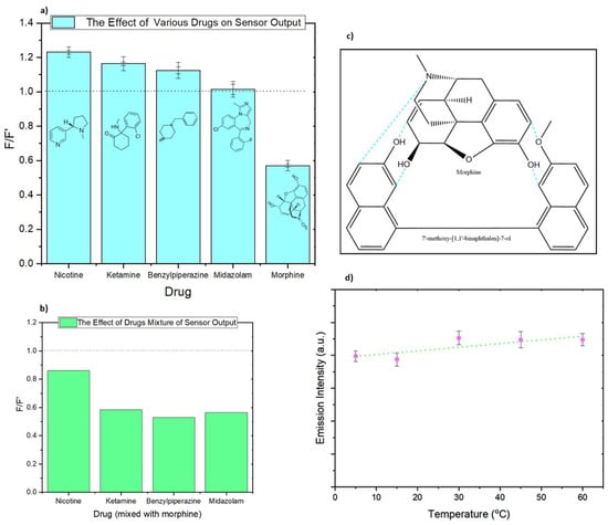 Dynamic quenching, collisional quenching, and photo-induced electron transfers (PETs) are temperature-dependent processes [64]. Typically, PET rates increase with higher temperatures due to enhanced molecular motion and collision rates. However, it is important to note that no significant changes in the emission-peak intensity of the sensor, while maintaining a constant concentration of morphine, are observed in response to variations in temperature (Figure 7d). This indicates that the quenching has occurred due to a strong binding interaction between the sensor and quencher (morphine). It can result from the formation of a non-fluorescent complex through non-covalent interactions, such as van der Waals forces, hydrogen bonding, or electrostatic interactions, between 7′-Methoxy-[1,1′-binaphthalen]-7-ol and morphine molecules (Figure 7c) [64,113].