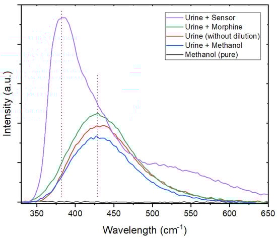 The results indicate a significant difference in peak wavelength between pure urine (428 nm) and the emission from the sensor (382 nm) within the urine matrix. The small shift in the fluorescence emission of the sensor (13 nm blue shift) can be attributed to alterations in the solvent’s polarity, viscosity, and hydrogen-bonding characteristics [64,118]. Notably, methanol dilution does not diminish the fluorescence intensity of the urine. However, the introduction of a morphine standard solution (in methanol) to the urine sample leads to an increase in the fluorescence intensity of the broad urine-emission peak.