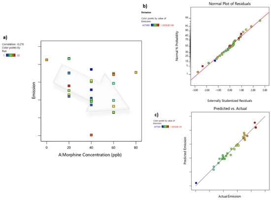 (a) Sensor’s response to morphine concentration: This panel illustrates the dynamic response of the sensor as it detects variations in morphine concentration within urine samples. (b) Normal plot of residuals: In this plot, the residuals are visually examined for adherence to normal distribution assumptions, providing insights into the model’s performance. (c) Predicted-versus-actual graph: This graph showcases the predictive accuracy of the model by comparing the predicted sensor’s fluorescence emission with the actual values.